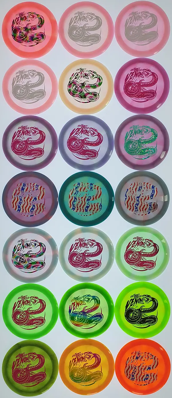 Drive your fangs into the all-new Venom. This entirely retooled disc is here to stay. That’s why our team took everything that works (and nothing that doesn’t) about the previous Venom to bring you a reimagined, consistent, overstable maximum distance driver. Fulfilling a need in many players bags, this addition to our lineup will become a favorite amongst power throwers and those looking for a reliable distance driver.